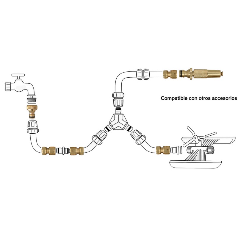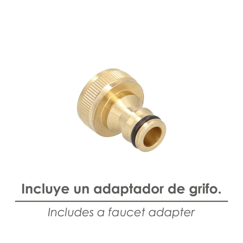 - Incluye un lanzarriegos, dos conectores de manguera 1/2" (uno con funcion stop) y un adaptador de grifo 1/2"