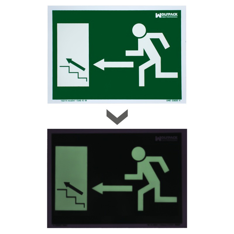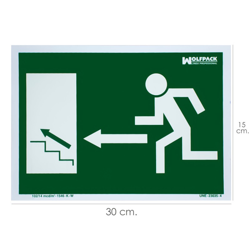 Cartel / Señal Fluorescente Salida Escalera Izquierda Arriba 30 x 21 (Alt.) cm.