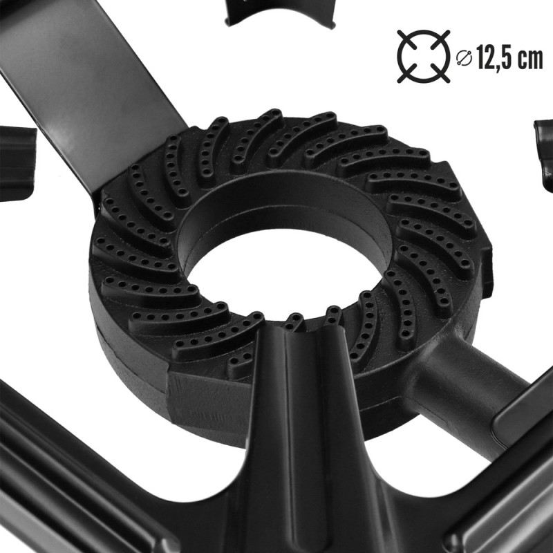 - El quemador de hierro con un diámetro de 12,5 cm garantiza una distribución uniforme del calor, permitiéndote cocinar tus platillos con precisión y eficiencia.