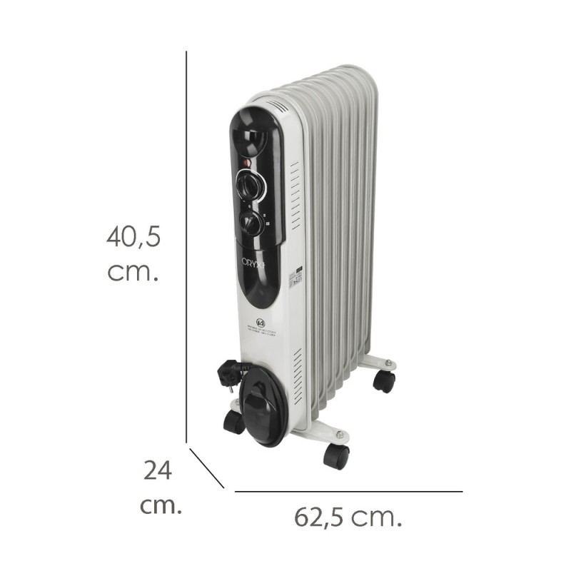 - Este radiador cuenta con un práctico asa de transporte, termostato de ambiente para prevenir sobrecalentamientos, 4 ruedas que facilitan su desplazamiento y un peso de 9,4 kgs.